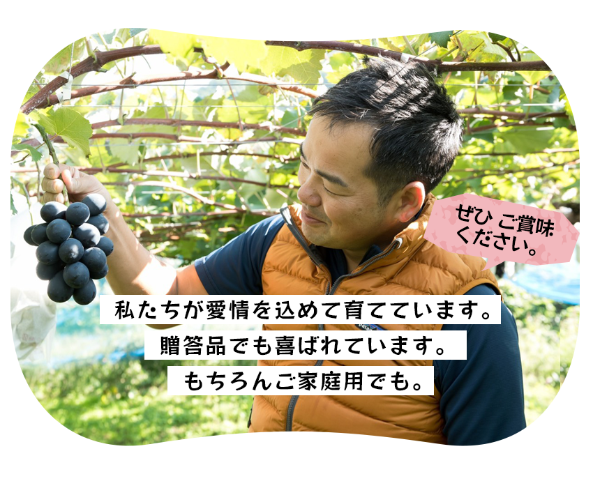 近年人気が高まっているシャインマスカット。種がなく皮ごと食べられる手軽さが大きな特徴です。酸味は少なく高い糖度を持ちつつも上品なマスカット香による爽やかな味わいで、多くの方から愛されています。まさにぶどうの良いところを全部詰め込んだと言えるシャインマスカットを、当果樹園では高山村の恵まれた気候の中で丁寧に栽培しています。大人気のシャインマスカットをお召し上がりください。